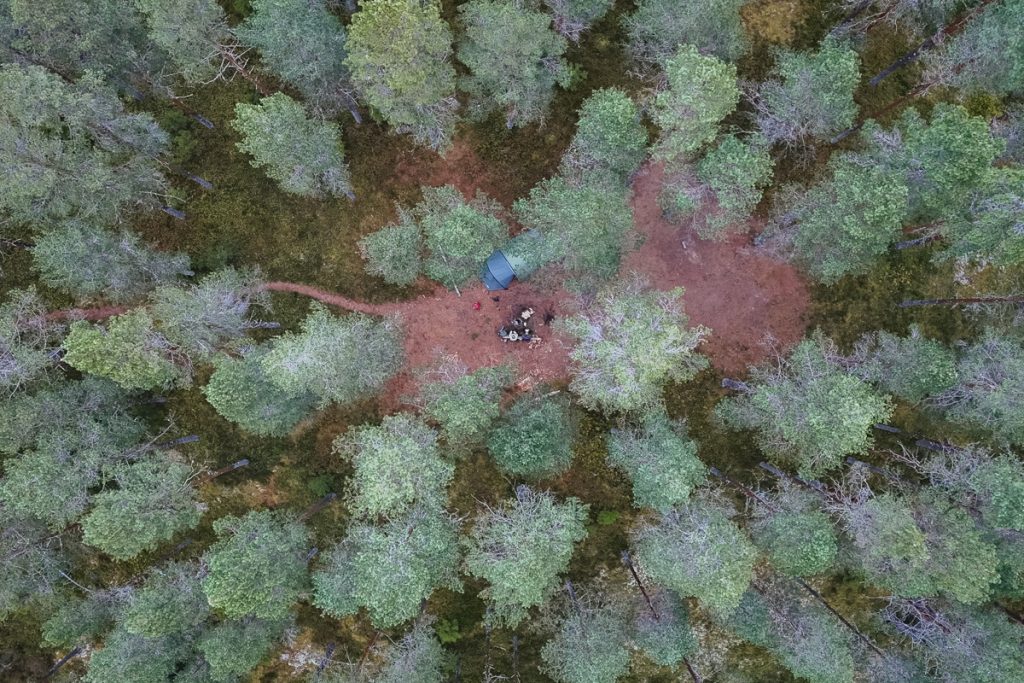 Pystytimme teltan Arpaiskämpän telttailualueelle, joka sijaitsee arviolta 50 metrin päässä kämpältä kukkulalta mäntyjen keskeltä. Telttailualueelle kuljetaan hiekkaharjua pitkin, mikä tekee tästä telttapaikasta erityisen.