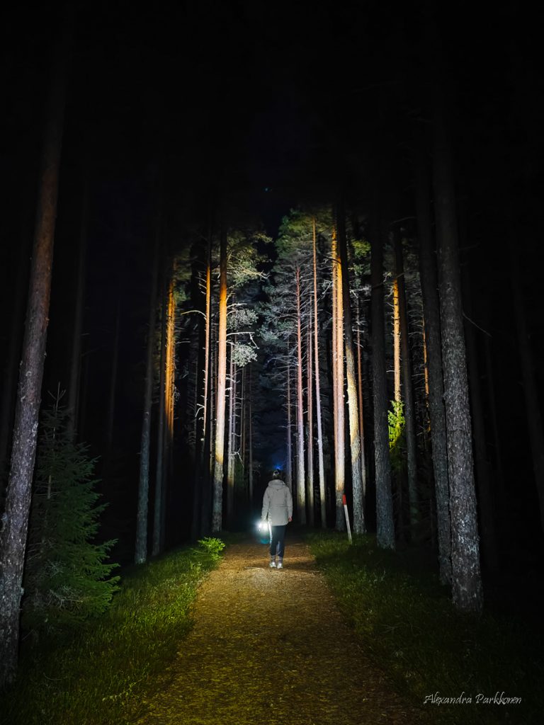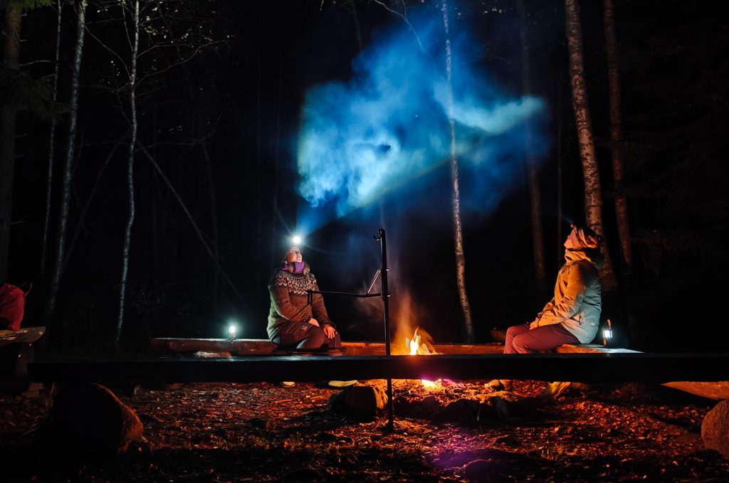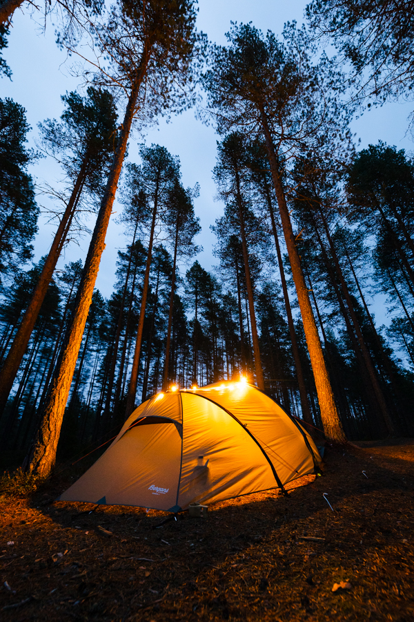 Iltaa vietimme, kuten telttaillessa yleensä on tapana, hyvinkin rauhallisissa oloissa. Teimme ruokaa nuotiolla pitkien keskusteluiden siivittämänä, kävimme otsalamppujen valossa kävelyllä hiekkaharjuilla ja palasimme jälleen nuotion äärelle syömään. Pidän siitä, ettei yön yli retkeily vaadi mukavuuksista luopumista ja tällaiset telttapaikat ovat hyvin matalan kynnyksen kohteita.
