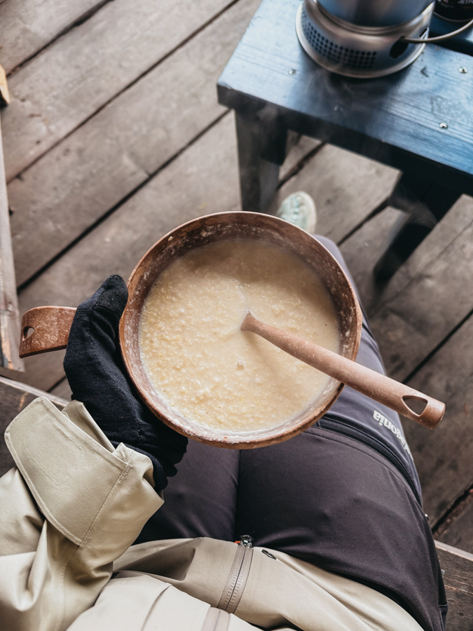 Sytyttelimme nuotion ja keitimme trangialla puuroa sekä kahvia. Telttayön jälkeen aamukahvi maistui taivaalliselta. Puhumattakaan siitä, että sen pääsi nauttimaan Kaihiharjun syksyisissä maisemissa. Aikainen ja kolea viikonlopun aamu ei ollut vielä tuonut paikalle muita retkeilijöitä, joten saimme nauttia olostamme kaksin.