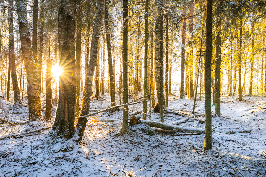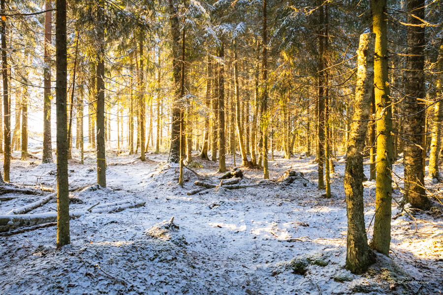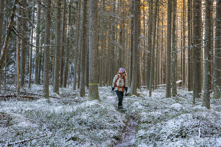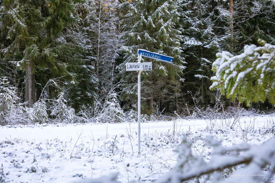 Luontopolun varrella on vanhan näköisiä opasteviittoja. Tätä kautta reitti Kivijärvelle on kulkenut luultavasti jo pitkän aikaa, mutta en vain ole aikaisemmin löytänyt tietoa siitä. Polku kulkee upeiden sammalpeitteisten metsien halki, joita koristaa ohuen hento lumikerros. Hetken aikaa kuljetaan kahden peltokaistaleen välissä, kunnes polku suuntautuu jälleen metsään. Joulukuinen aurinko halkoo puita sykähdyttävästi ja jään hetkeksi vain ihailemaan tuota näkyä.
