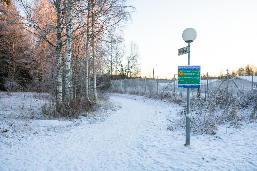 Karttaselainta katsoessa, reitti Kivijärven laavulle on merkitty kulkevaksi Sakarinmäen metsätietä pitkin. Saamassani sähköpostissa opastettiin kuitenkin lähtemään Kourahallin pihapiiristä. Koko joulukuu on ollut harmaata ja sateista, mutta tänään ensimmäistä kertaa aurinko paistaa. Pilvetön sää on kiristänyt pakkasen -10 asteen lukemiin ja ohut lumikerros narskuu jalkojeni alla, kun nousen autosta Kourahallin edustalla.