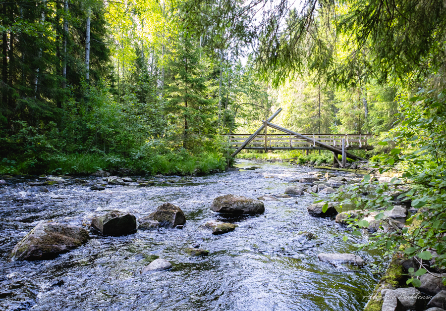 Maasto: kangasmetsä, joki, tieosuuksia, pitkospuut